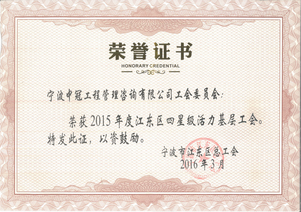 近期經(jīng)寧波市江東區(qū)總工會評定,我公司被授予“2015年度江東區(qū)四星級活力基層工會”榮譽(yù)稱號。