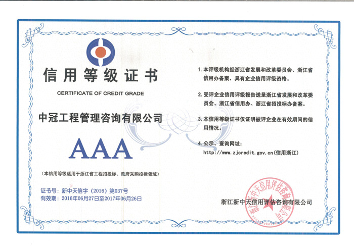 近期經(jīng)浙江新中天信用評估咨詢有限公司的評測,我公司順利取得適用浙江省工程招標投標、政府采購投標領域“AAA”級信用資格的延續(xù)。